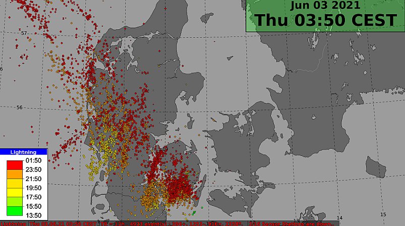 (jesper grønne) når lynkanalen er fuldendt ved mødet mellem streameren og lederen, kan strømmen flyde frit mellem sky og jord. »jeg er overbevist om, at lyn kan slå ned i en høj skibsmast. Vejrkortet viser hvordan nedbøren har bevæget sig over danmark de seneste 3 timer dagen i dag. Hvordan kan jeg se historiske lynnedslag? Værst gik det til på ærø hvor man fik 45,8 mm regn på en halv time.